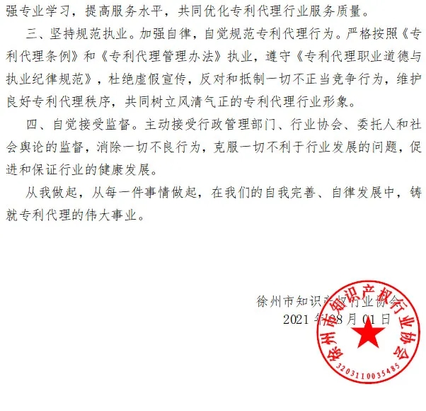 三、堅持規范執業(yè)。加強自律,自覺(jué)規范專(zhuān)利代理行為。嚴格按照《專(zhuān)利代理條例》和《專(zhuān)利代理管理辦法》執業(yè),遵守《專(zhuān)利代理職業(yè)道德與執業(yè)紀律規范》,杜絕虛假宣傳,反對和抵制一切不正當競爭行為,維護