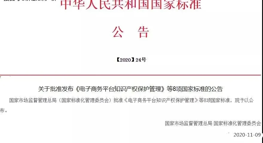 國家知識產(chǎn)權局牽頭,多部門(mén)共同參與制定了《電子商務(wù)平臺知識產(chǎn)權保護管理》國家標準,標準于2020年11月9日批準發(fā)布,并于2021年6月1日起實(shí)施。